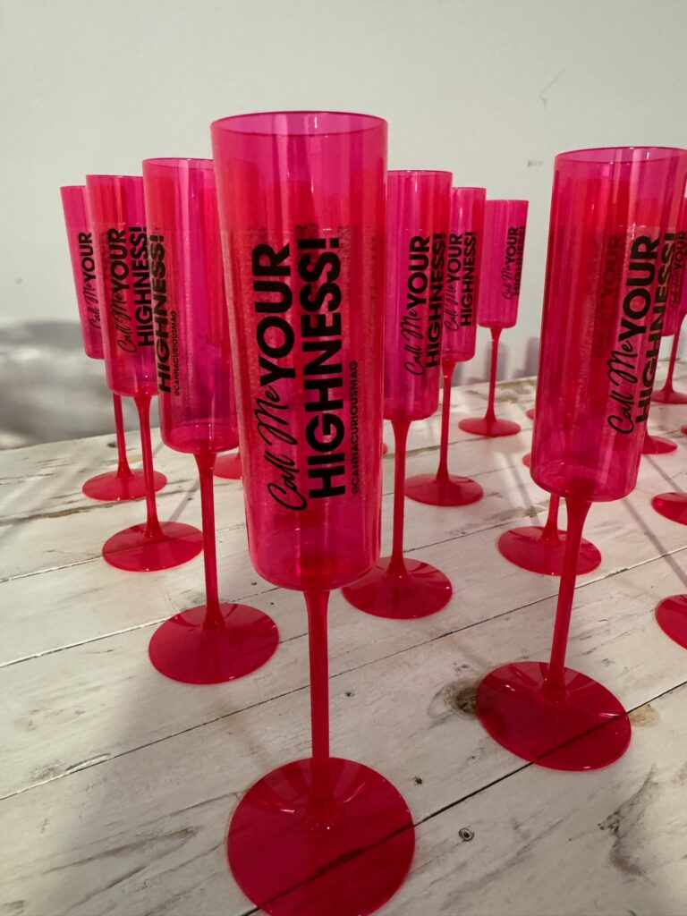 Picture this: A stunning pink throne fit for an industry queen, nestled against a mesmerizing mosaic of cannabis leaves—a backdrop so Instagram-worthy it practically demanded attention. Custom hot pink champagne flutes emblazoned with “Call me your highness” set the tone for an evening of pure magic, with Cann’s delicious low-THC/CBD beverages flowing freely.
